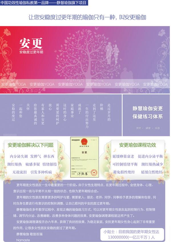 静慧瑜伽在多年教学过程中,发现正确的瑜伽练习方式,可以对更年期女性朋友起到控制行为、控制情绪、调节内分泌、改善睡眠、改善多种身体问题的效果,安更瑜伽调理课程就这样产生了。