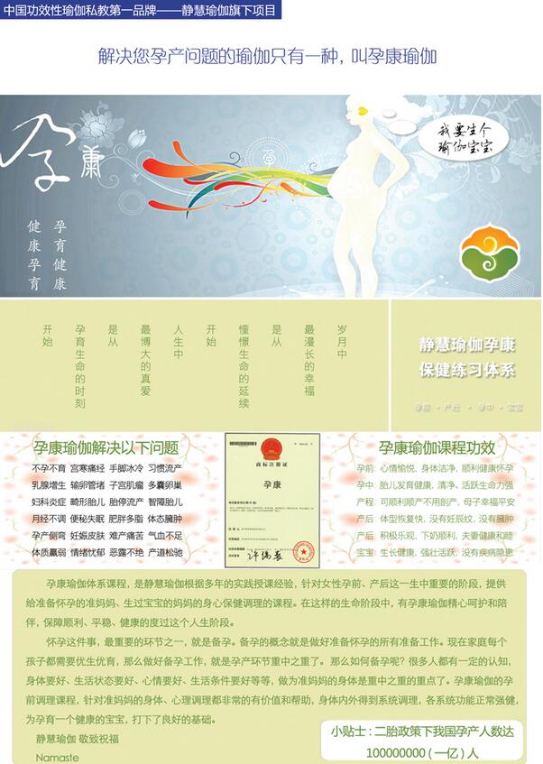 2孕康瑜伽保健练习课程——针对孕前调理,产后恢复保健练习的课程体系,用瑜伽方法解决不孕不育、病变胎儿、产后恢复的孕期问题。