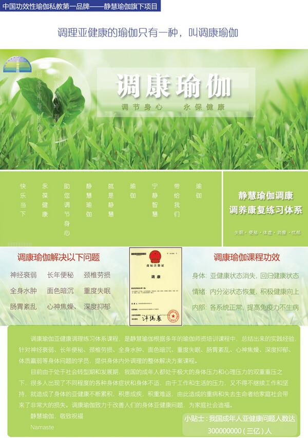 4调康瑜伽保健练习课程——针对亚健康人保健练习的课程体系,用瑜伽方法解决现代人由于工作生活情感压力带来的身心问题。